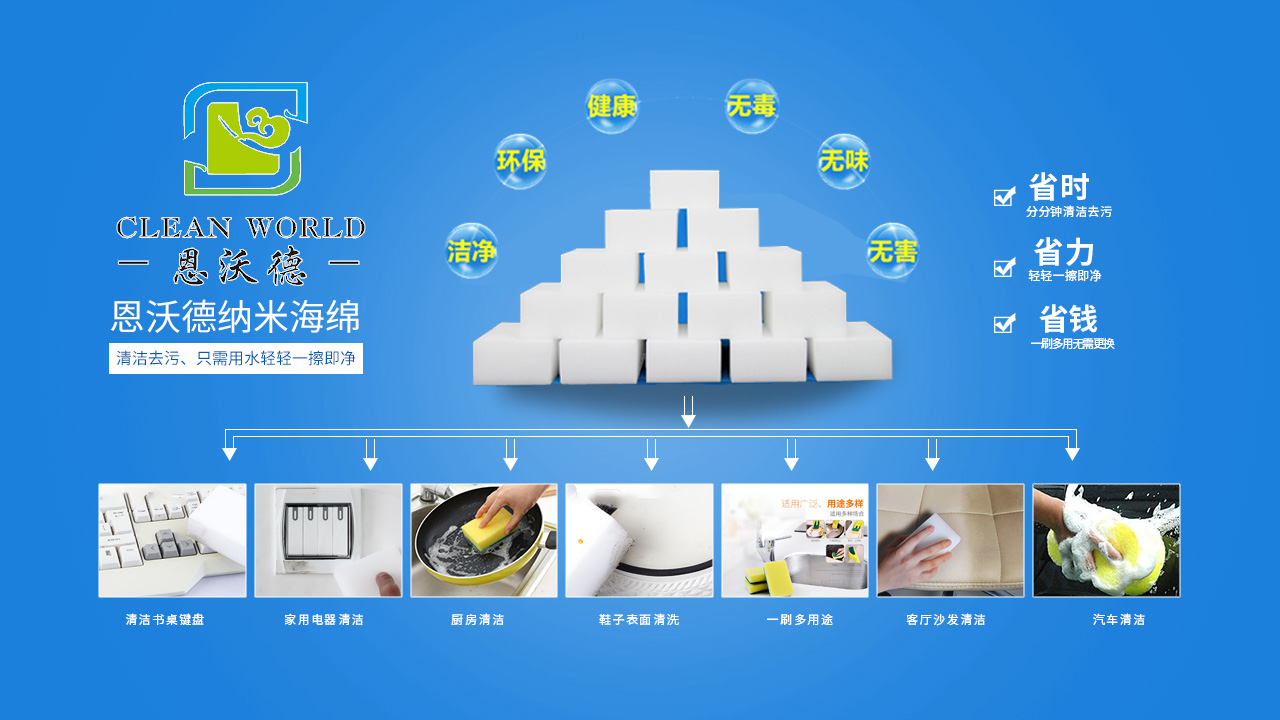 納米海綿是一種有高開孔率的三維網(wǎng)格結(jié)構(gòu)的新型泡沫塑料,采用物理去污的機(jī)理,依靠納米海綿特殊三維網(wǎng)狀結(jié)構(gòu)(每個(gè)小顆粒比頭發(fā)絲的萬分之一還小)將其浸濕后,其內(nèi)部就會(huì)形成無數(shù)個(gè)納米級(jí)毛細(xì)管開孔結(jié)構(gòu),在抹拭過程自動(dòng)吸附物體表面的污漬。所以這些海綿塊只需要加一點(diǎn)水,就變成清潔力強(qiáng)的產(chǎn)品,可以擦拭頑固的污漬,也不用擔(dān)心會(huì)有刺激性化學(xué)物質(zhì)。納米海綿可以用于家中的大多數(shù)物品的表面,從油煙機(jī)到灶臺(tái)、墻壁上的畫畫印記、浴室里的水漬水垢、浴缸污垢、茶杯里的茶漬、墻壁劃痕等通常難以擦洗的表面。